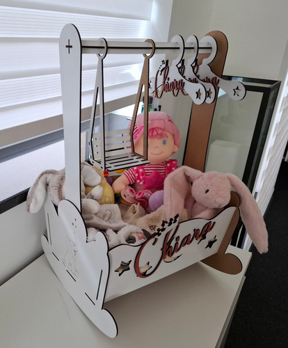 Geboortewiegje en 3 kapstokjes, gepersonaliseerd met de naam van de baby. Kleurkeuze: roze, blauw of groen.